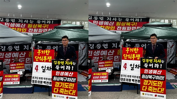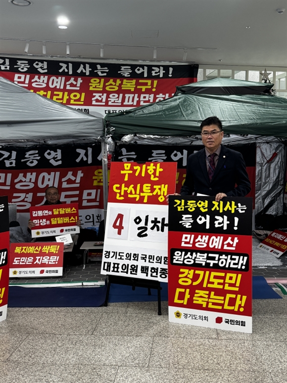 경기도의회 보건복지위원회 윤태길 의원(국민의힘, 하남1)은 11월 28일(금) 도의회 1층 로비를 찾아, 김동연 지사의 민생예산 대규모 삭감에 맞서 단식 투쟁 중인 백현종 국민의힘 대표의 1인 시위를 지지하며 연대 의지를 밝혔다.