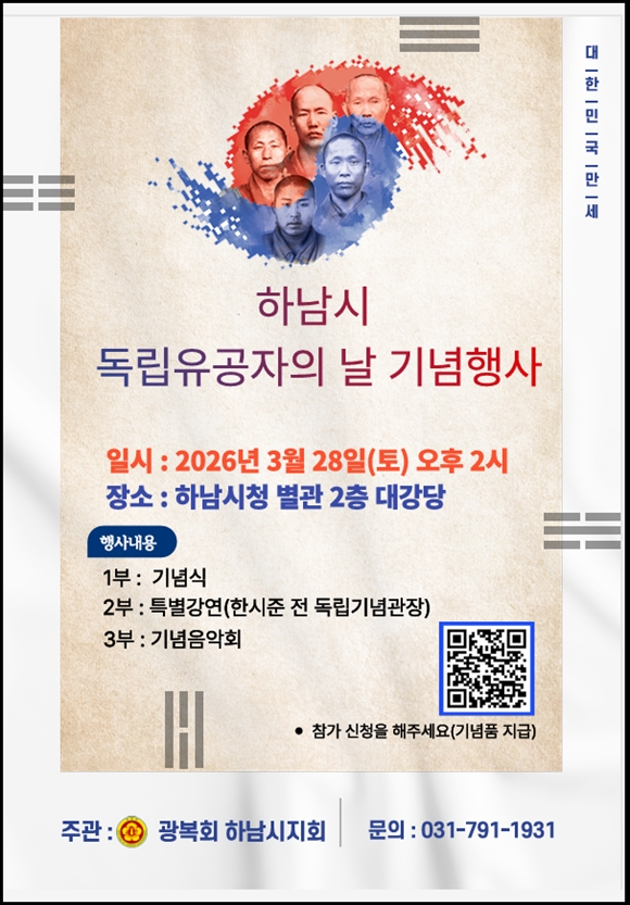 이번 행사는 하남시민이라면 누구나 선착순으로 입장 가능하며, 자세한 사항은 광복회하남시지회(031-791-1931)를 통해 확인할 수 있다.